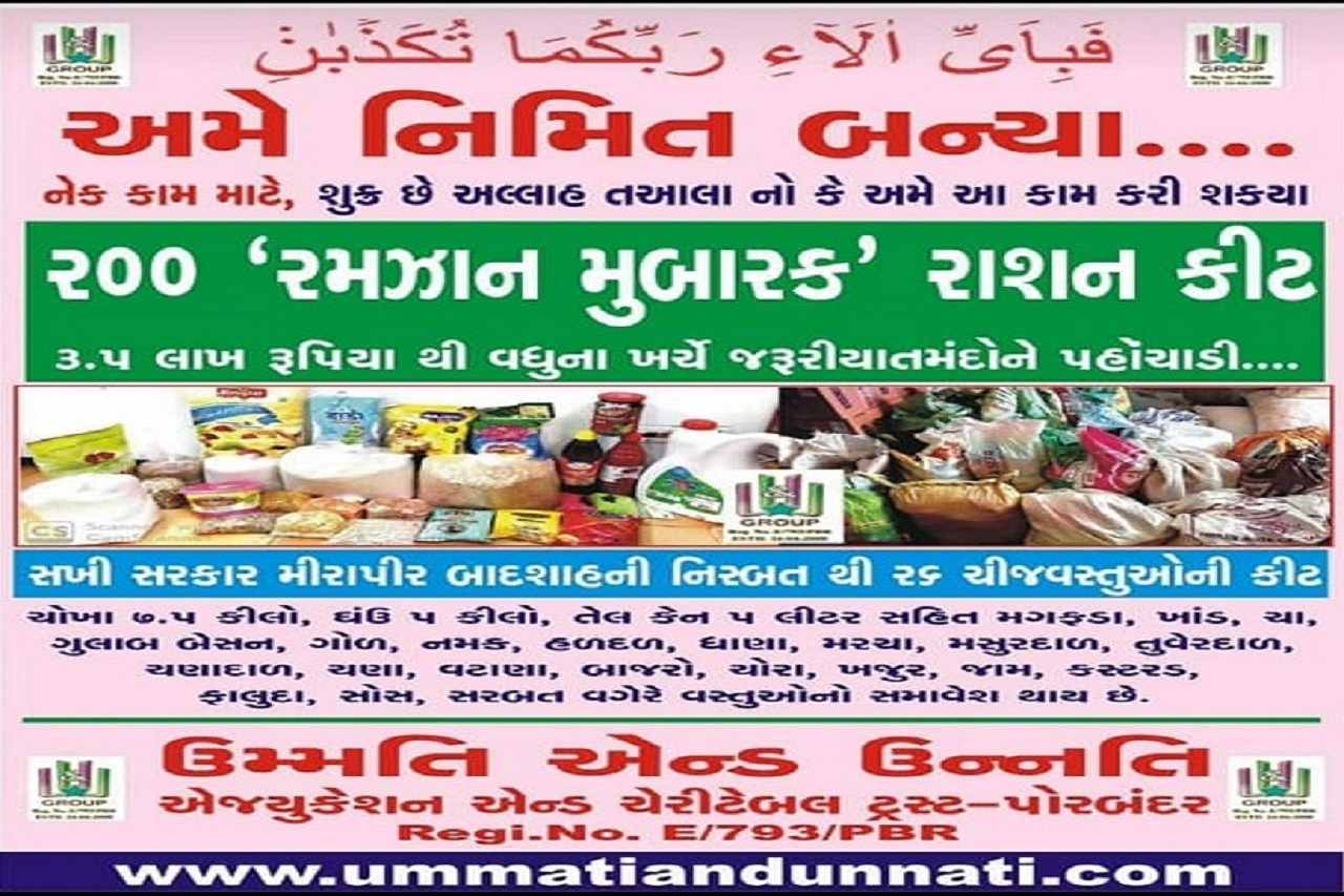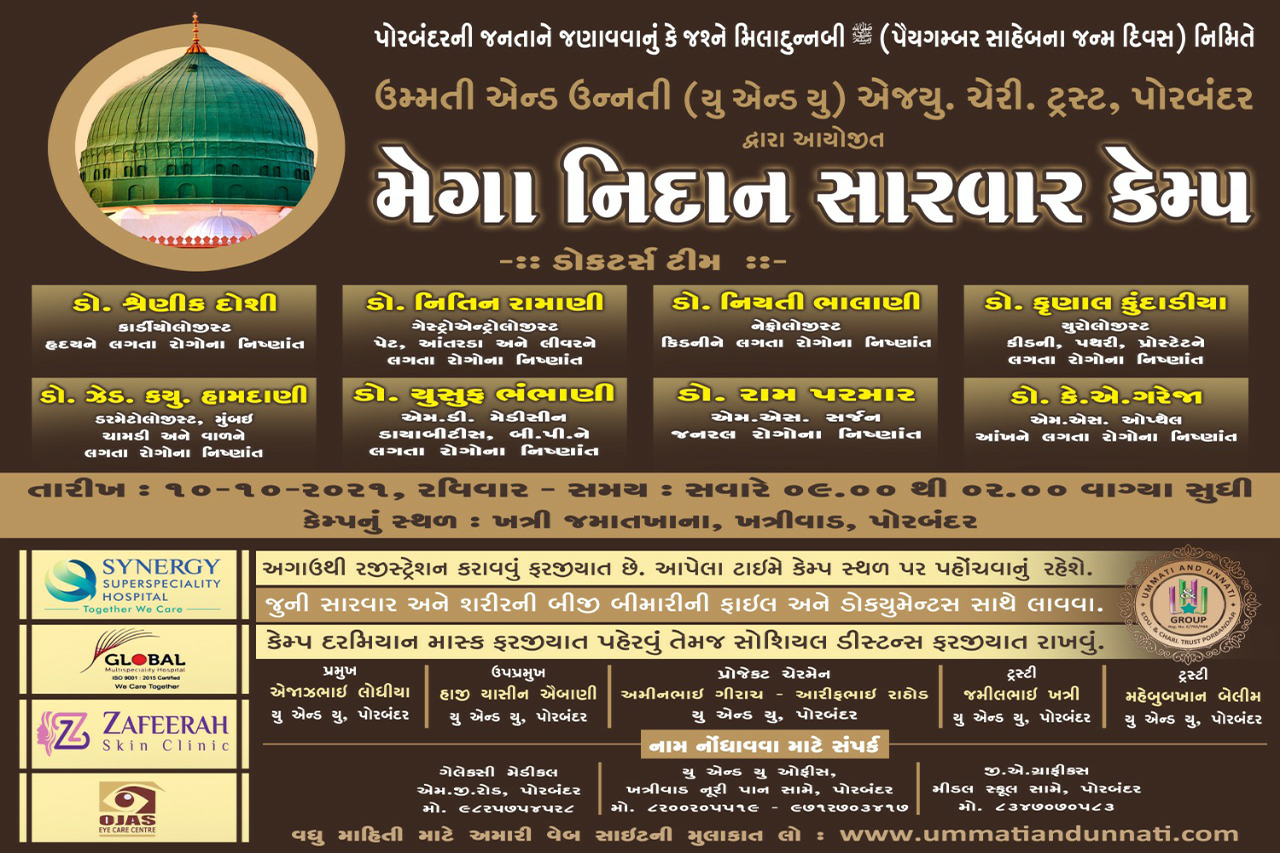 પોરબંદર, તા . ૧૦ સમગ્ર વિશ્વ માટે રહેમતબનીને આવેલ હઝરત મુહમ્મદપૈગમ્બર સાહેબ નાં જન્મદિવસ નિમિત્તેસૈયદ ઈકબાહાબાપુ તીરમીઝી દુઆ સાથે જ્ઞાતિ - જાતિ કે, ધર્મ ના ભેદભાવ વિનાયુ એન્ડ યુદ્વારા મેગા નિદાન સારવારકેમ્પ તા . ૧૦–૧૦–૨૦૨૧રવિવારના ખત્રીજમાતખાનામાંયોજવામાં આવેલ, જેમાં ૪૫૦ થી પણ વધારે દર્દીઓએ લાભલીધો . આ કેમ્પમાં રાજકોટની ની પ્રખ્યાત સીનર્જી હોસ્પિટલ નાં ડૉ. શ્રેણિક દોશી (હૃદયને લગતા રોગો), ડૉ . નિતિન રામાણી (પેટ, આંતરડા, લીવ૨ ને લગતા રોગો),ડૉ . કૃણાલ કુંદાડીયા (પથરી તથા પ્રોસ્ટેટને લગતારોગો),ડૉ.નિયતીભાલાણી( કિડની ને લગતા રોગો), મુંબઈ ના પ્રખ્યાત ઝફીરાહસ્કીનકલીનીક ડૉ. ઝેડ.ક્યું. હામદાણી(ચામડી તથા વાળનારોગો માટે), પોરબંદરનાગ્લોબલ મલ્ટીસ્પેશ્યાલીસ્ટ હોસ્પિટલના યુસુફ ભંભાણી (ડાયાબીટીસ તથા બીપીના રોગો માટે), ડાઁ. રામ ૫૨માર (જનરલ સર્જન), તથા ઓજસહોસ્પિટલના ડૉ.કે.એ.ગરેજા(આંખના રોગો માટે) એ પોતાની સેવાઆપેલ, આ કેમ્પમાં જરૂરીયાત મુજબ દવા ફ્રીમાં આપવામાં આવેલ તેનીસાથો સાથ ઈ.સી.જી. , ડાચાબીટીસ, બી.પી, વગેરે ફ્રી ચેકઅપ કરી આપવામાં આવેલ હતું. ટ્રસ્ટ ના પ્રમુખ એજાઝભાઇ લોધીયાએ તમામ ડોકટર્સ ટીમ નો આભાર વ્યકત કર્યો હતો.