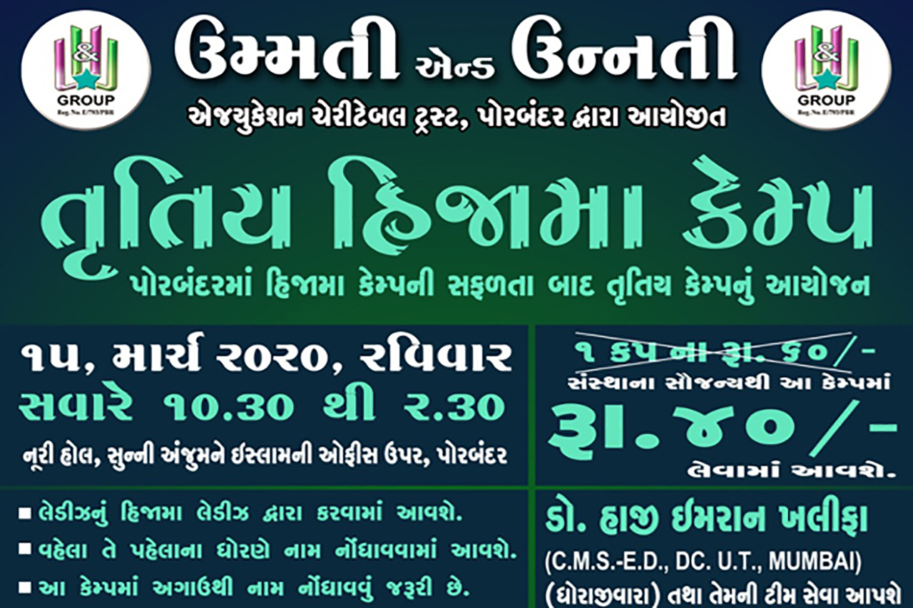 પોરબંદર ઉમ્મતી એન્ડ ઉન્નતી ( યુએન્ડયુ . ) એજયુકેશન એન્ડ ચેરીટેબલ ટ્રસ્ટ દ્વારા સાર્વજનિક મેગા નિદાન સારવાર કેમ્પ સંપન્ન.